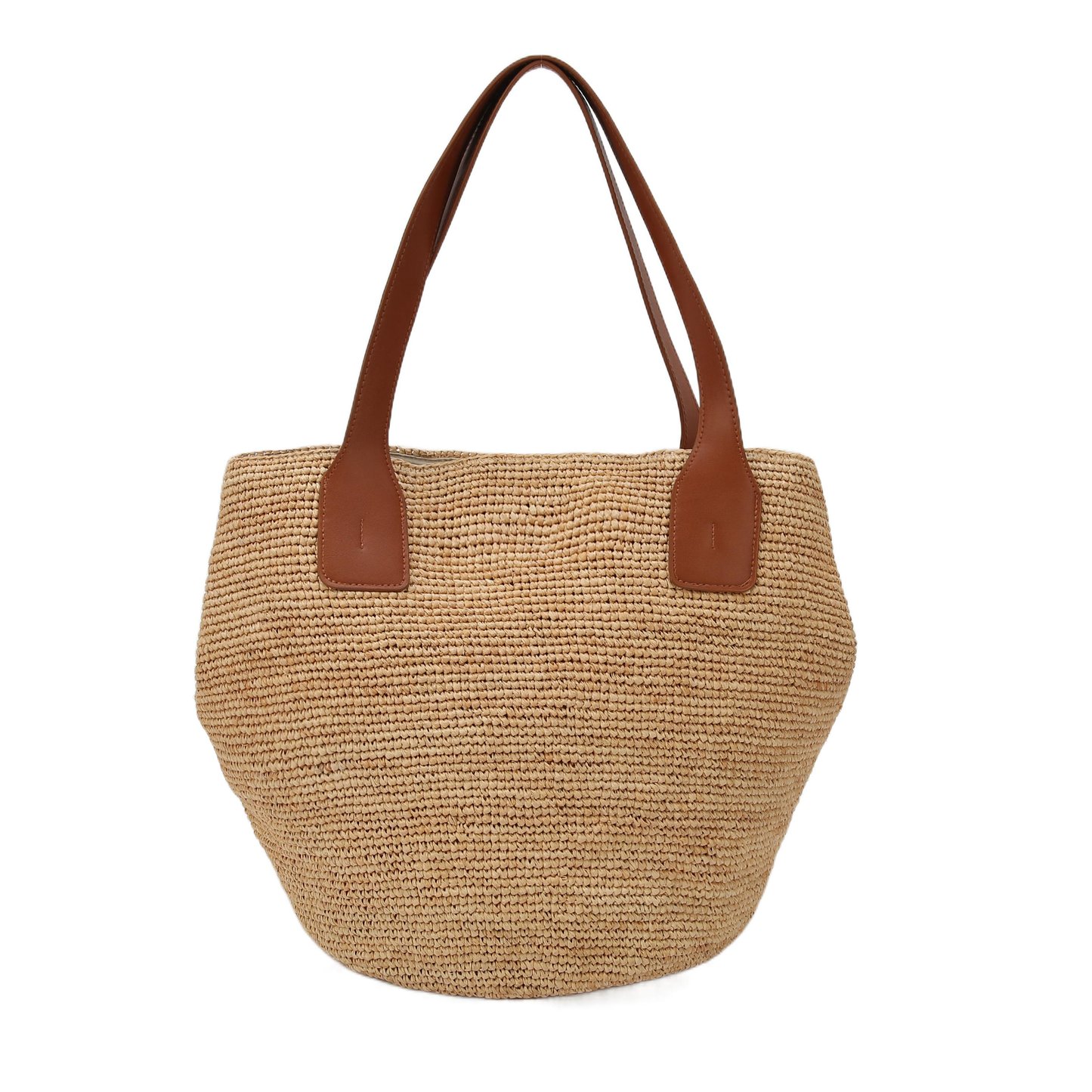 The brown leather handle creates a stylish spark when paired with the woven bag body.