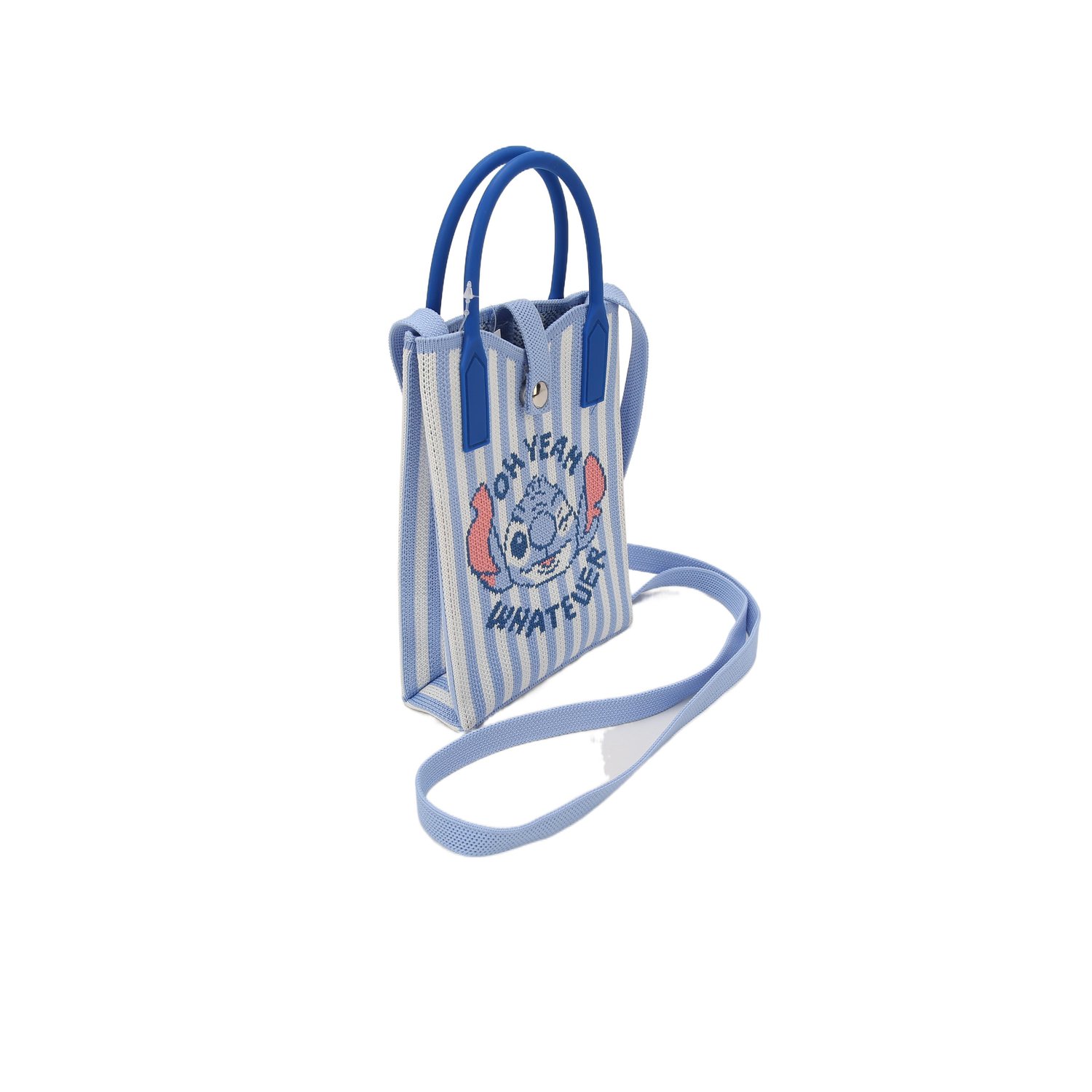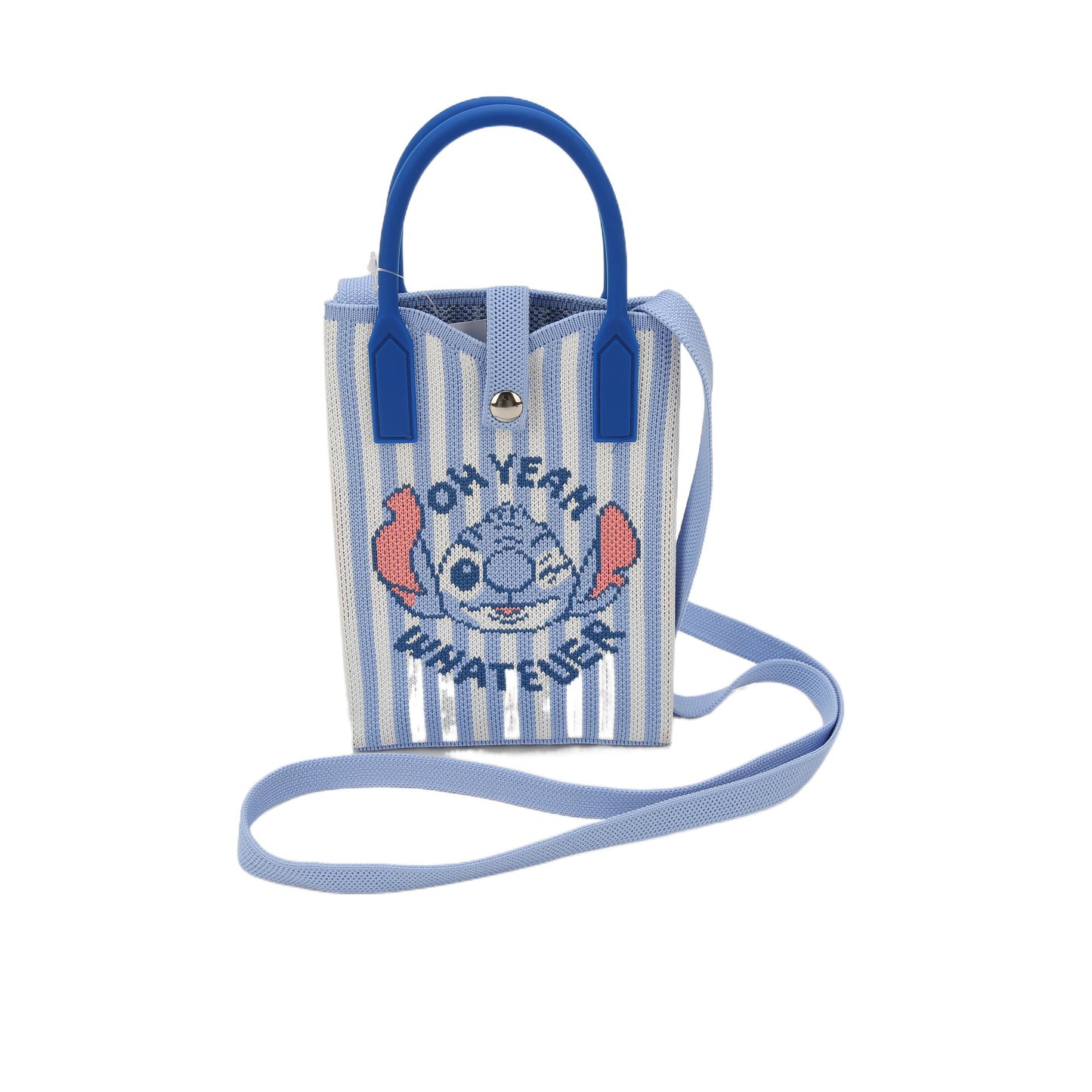 The crossbody bag has a blue-and-white striped background, paired with eye-catching letter embroidery patterns, and combines a blue handle and shoulder strap, presenting a trendy and stylish design.