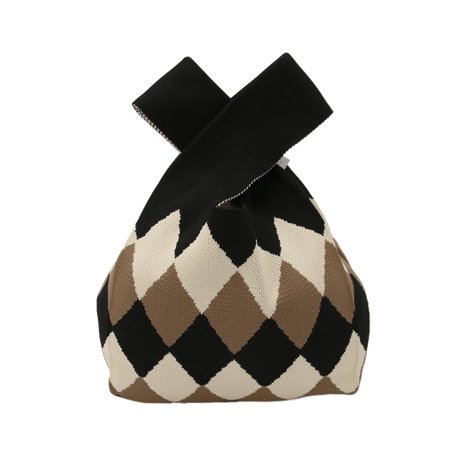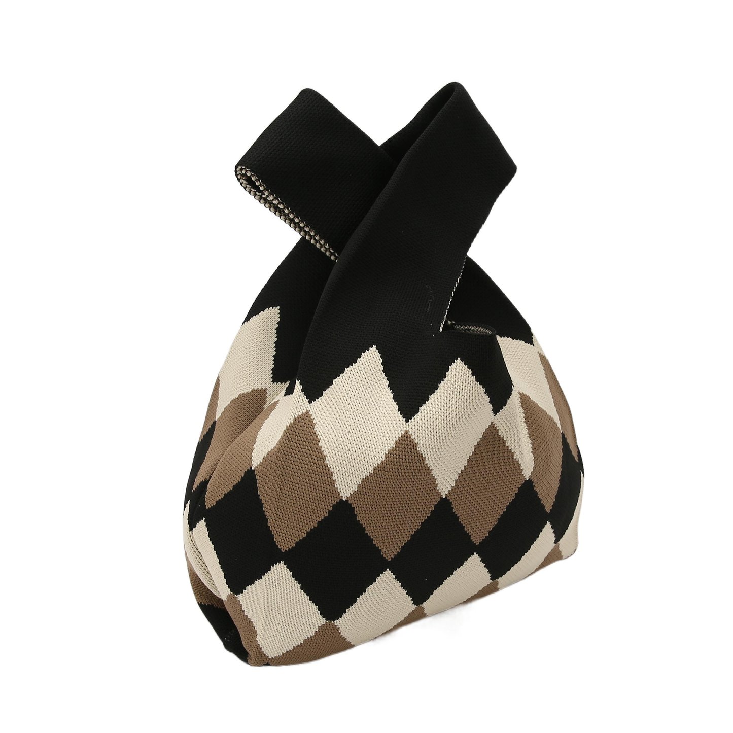 The handbag is crafted with a knitting technique, featuring a classic diamond pattern.