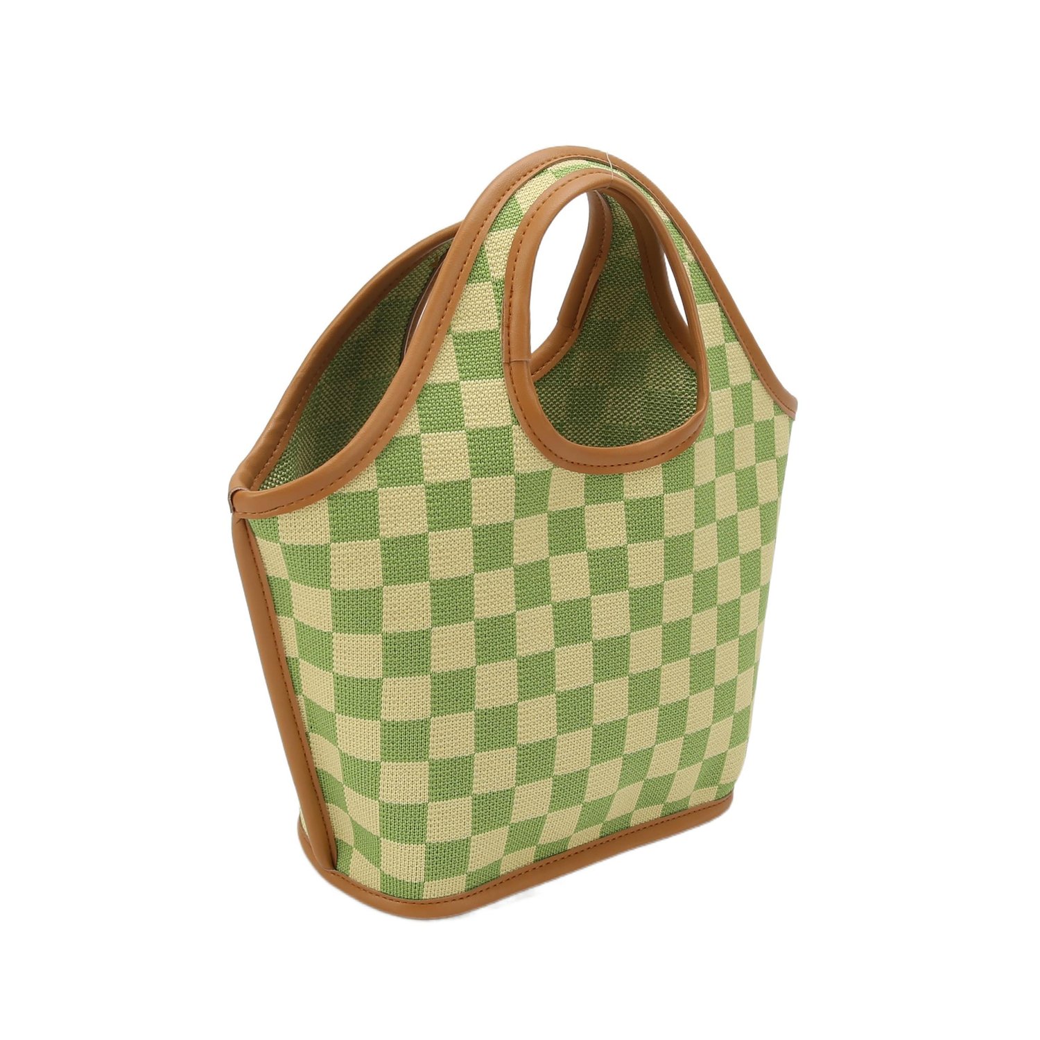 The body of the bag is covered with fresh green - white checkerboard pattern, matched with caramel - brown edging.