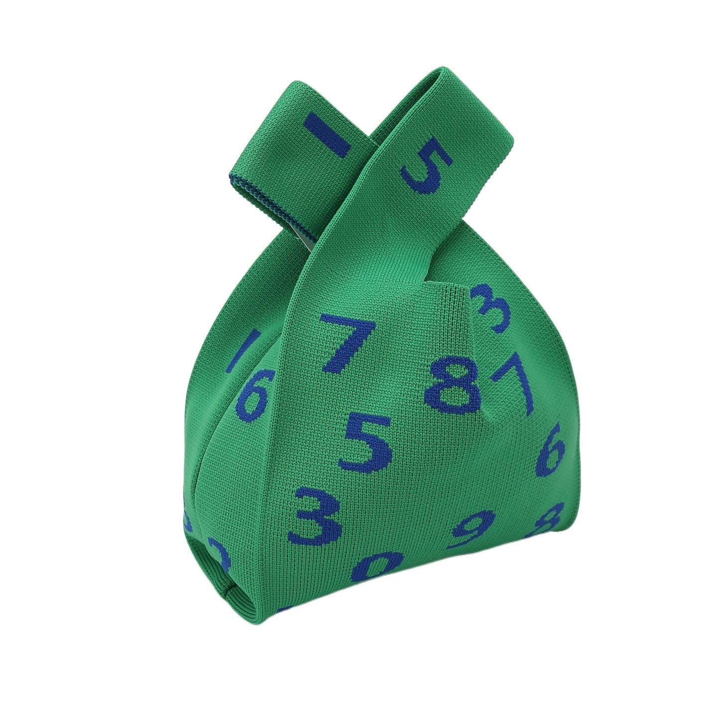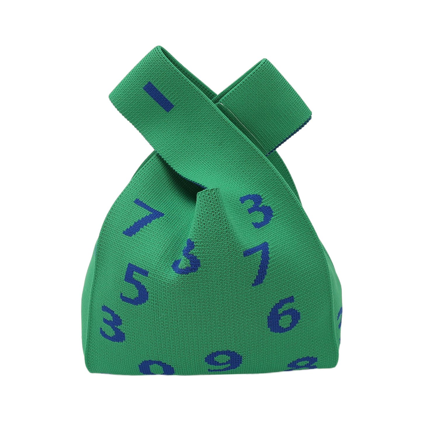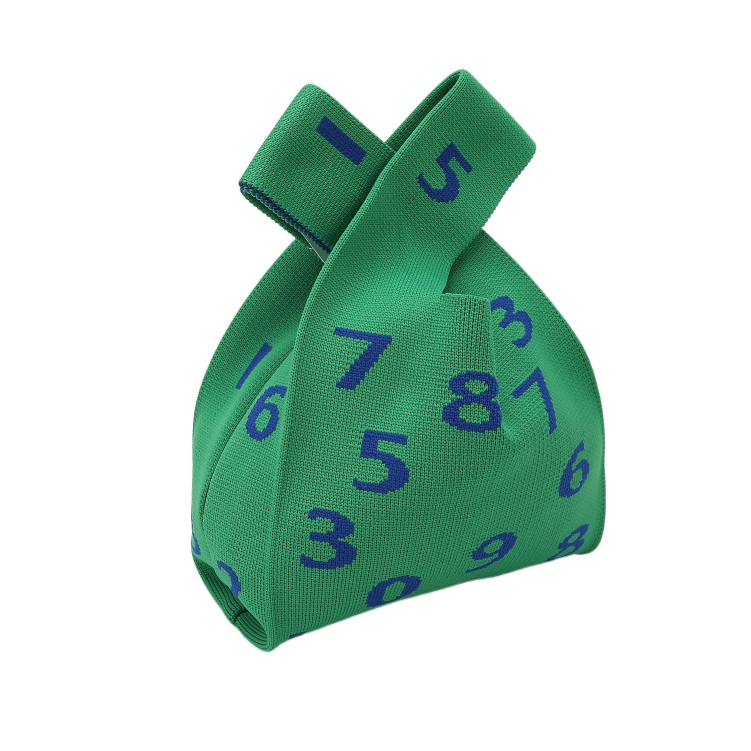 The bag has a green base, with digital prints presented through a weaving process. It features a unique cross - handle design, integrating fun aesthetics into practical functions.