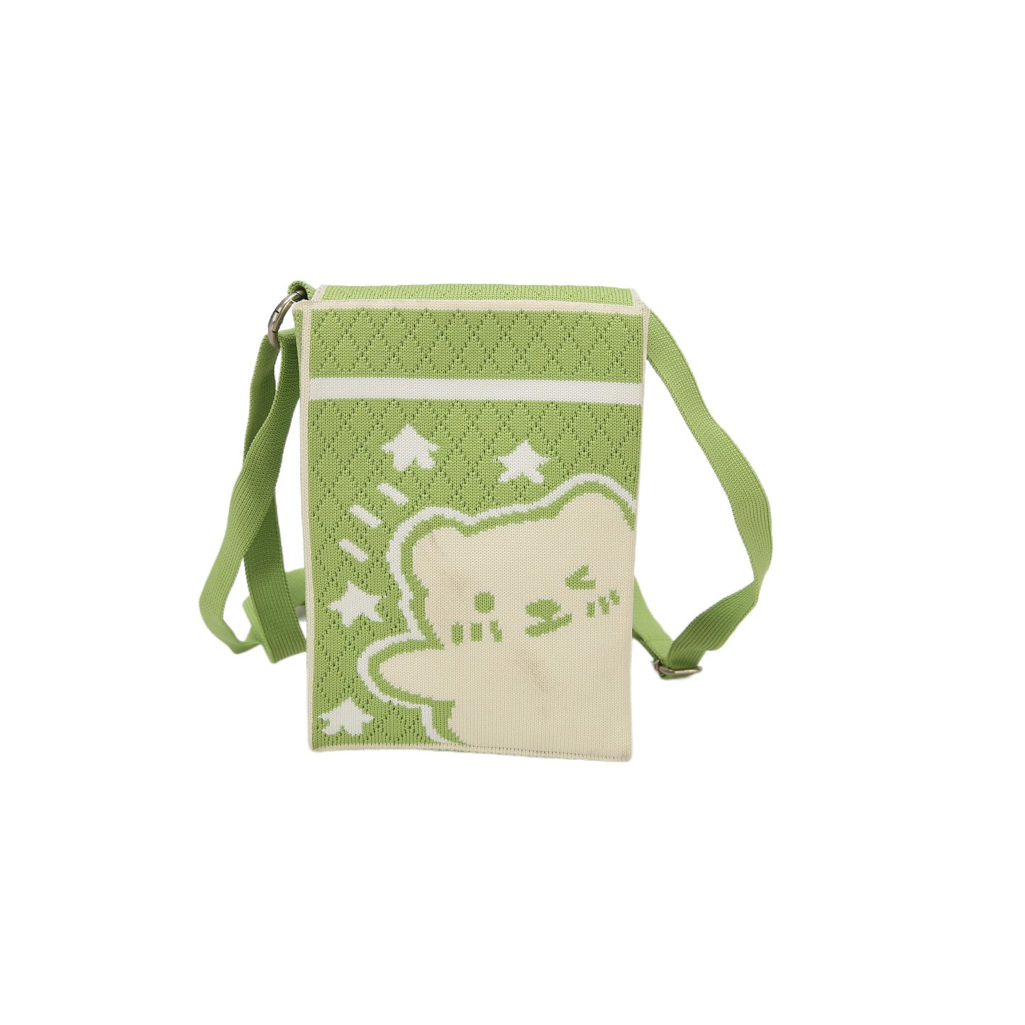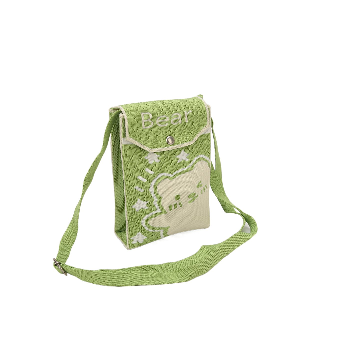 This is a green crossbody bag with the word ""Bear"" and decorative elements such as little bears and stars.