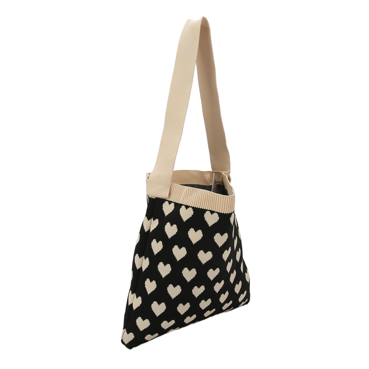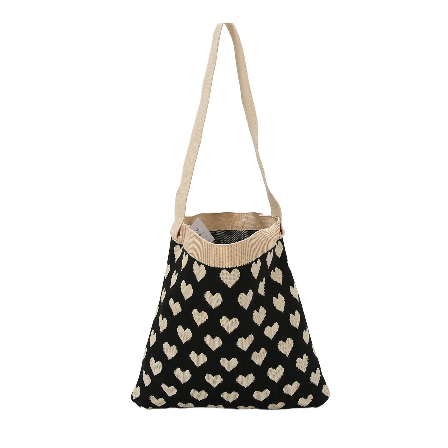 The handbag features a black and brown color scheme, is fully printed with heart patterns, and is paired with a contrasting - colored handle, integrating romantic aesthetics into a practical design.