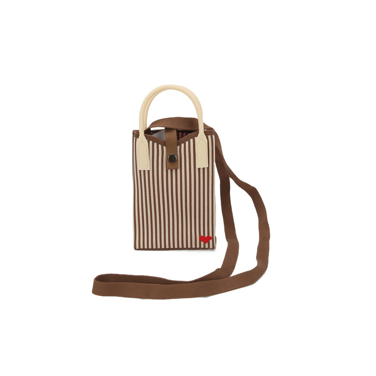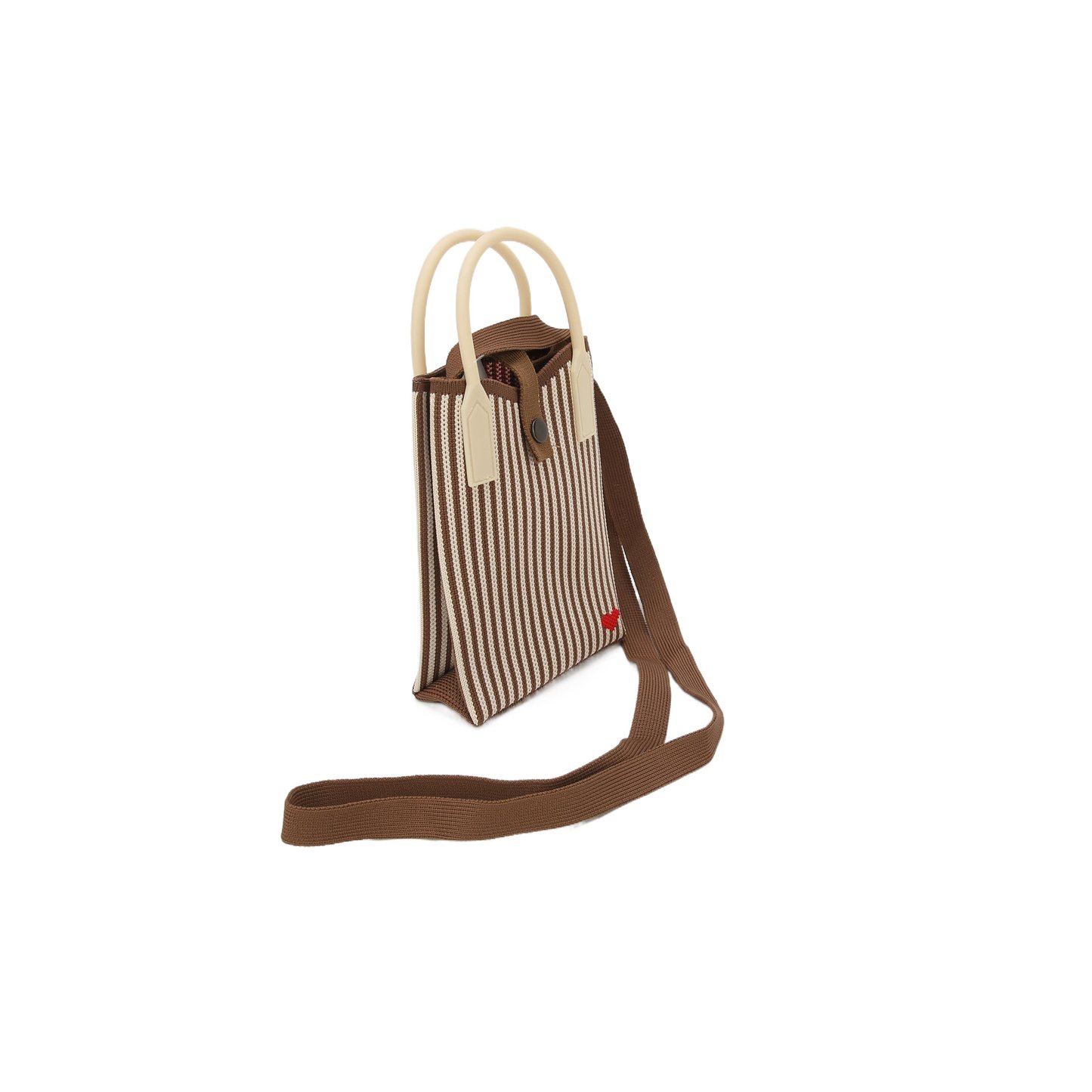 The striped hand - carried and cross - body bag takes the classic brown - and - white stripes as visual elements, and is paired with light - colored hand - held handles and a brown shoulder strap, presenting a design style that is simple yet stylish.
