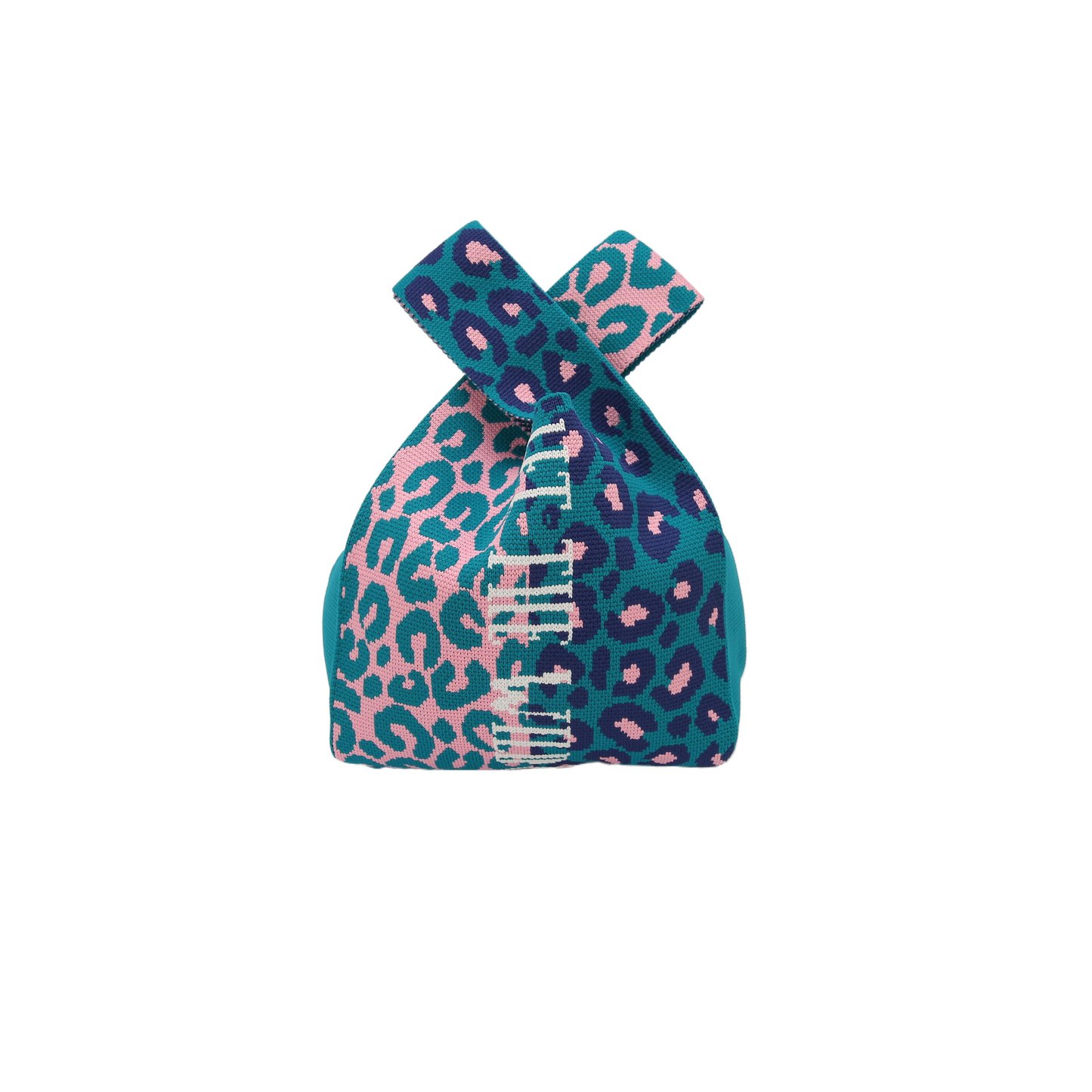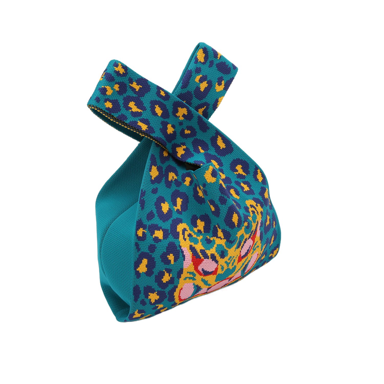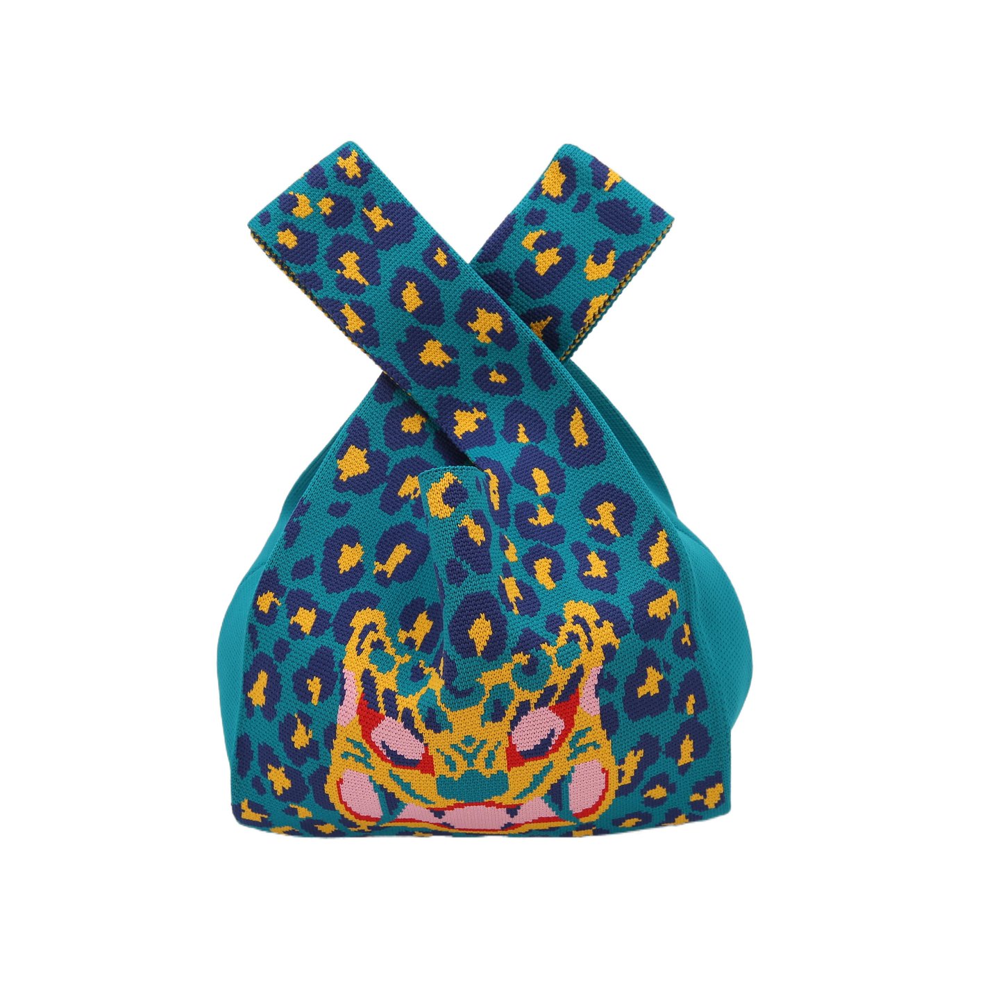 The handbag mainly features blue and green as its main colors, presents a leopard - print pattern, and is equipped with a cross - handle design.