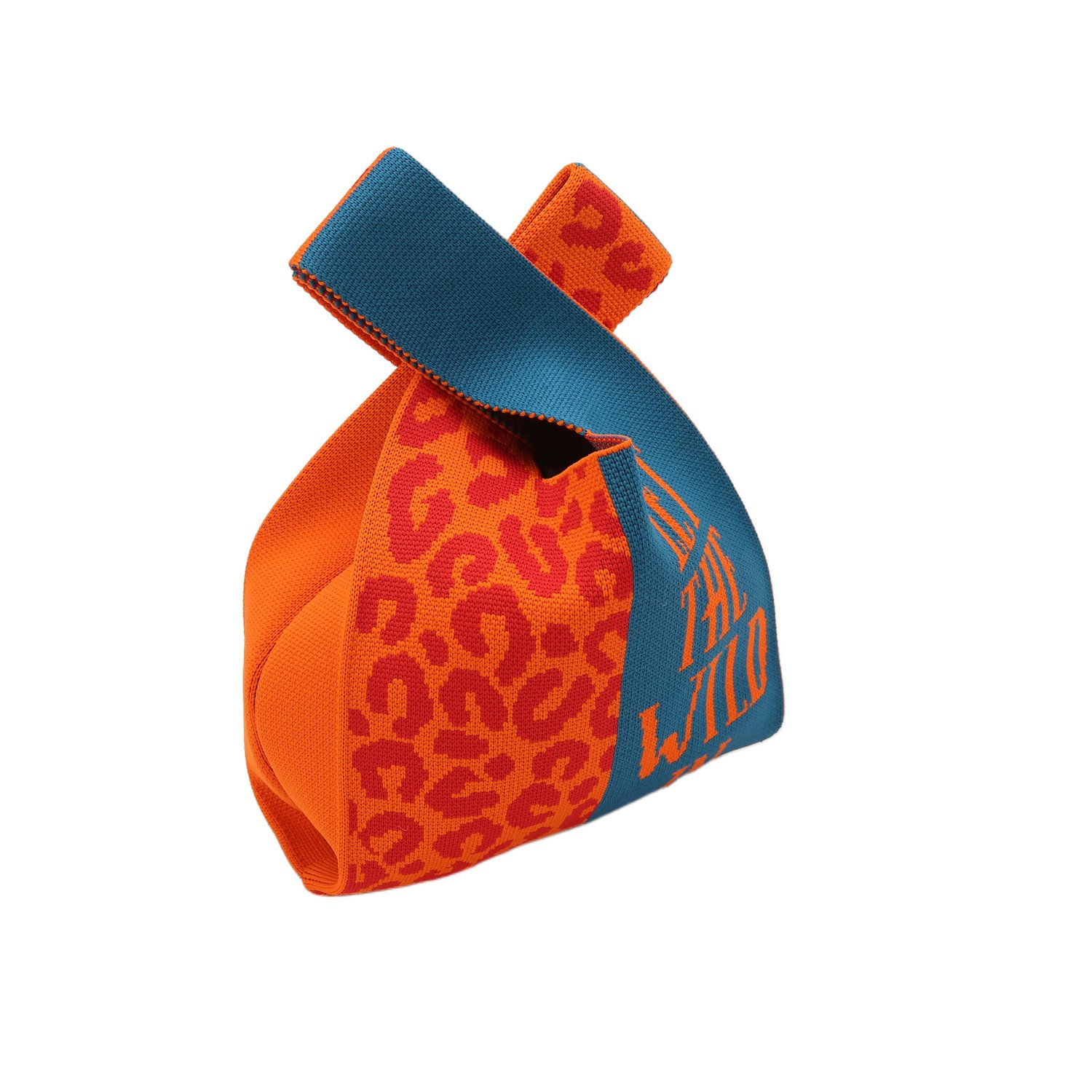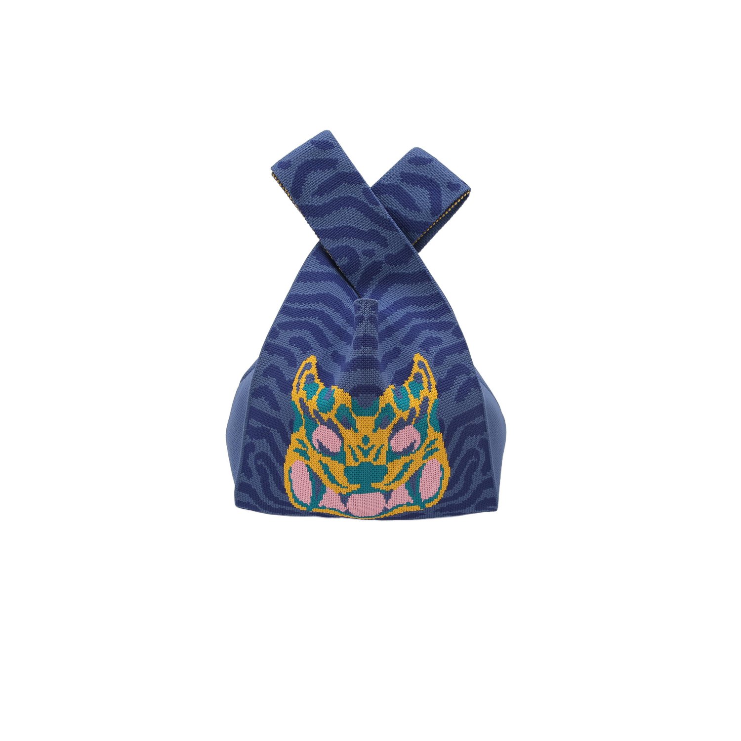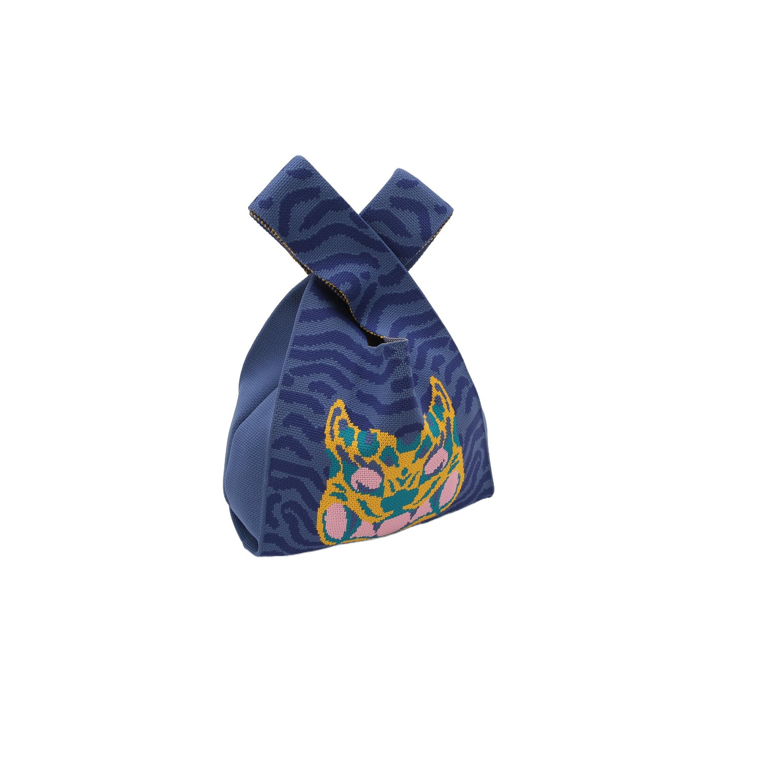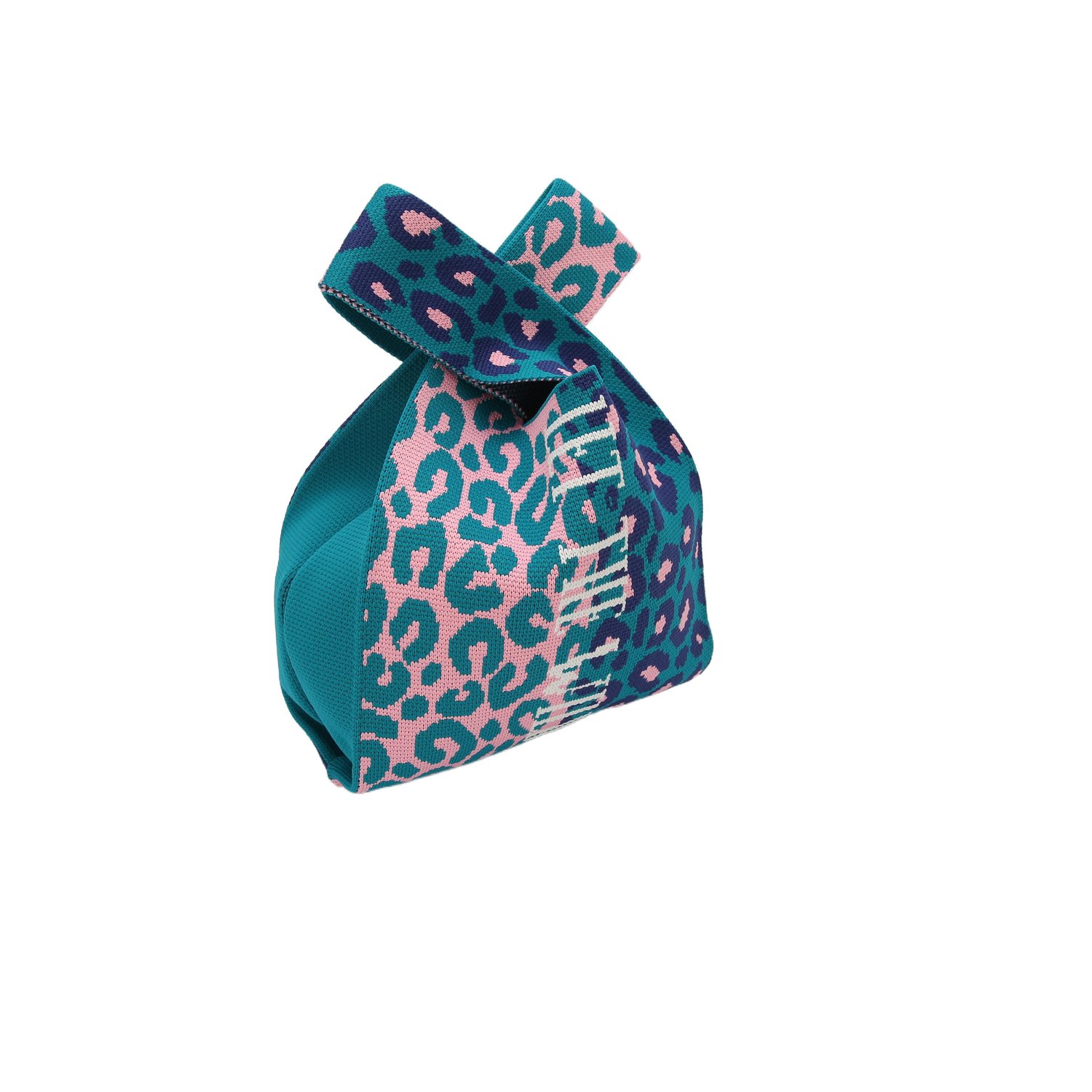 The handbag mainly features blue and green as its main colors, presents a leopard - print pattern, and is equipped with a cross - handle design.