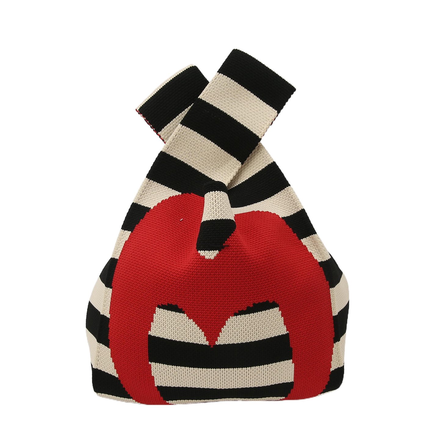 The handbag features a black - and - white striped base, with eye - catching red heart - shaped patterns.
