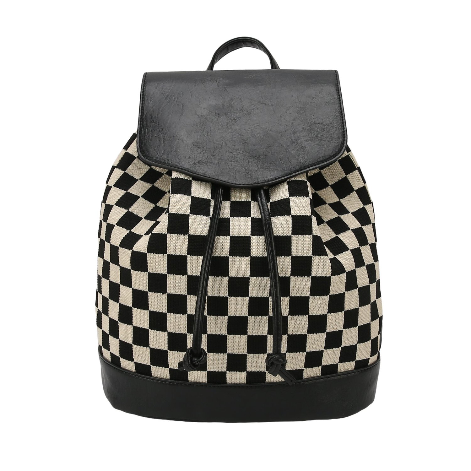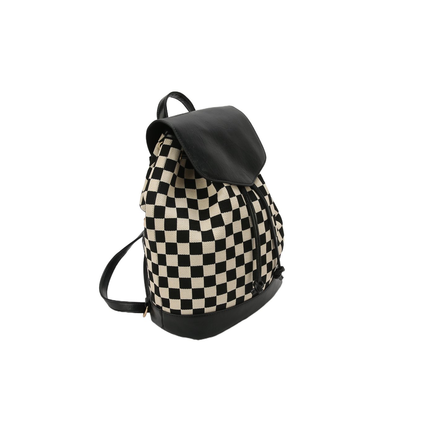 The classic black and white checkerboard pattern covers the entire body of the bag, paired with a black leather top cover and bottom.