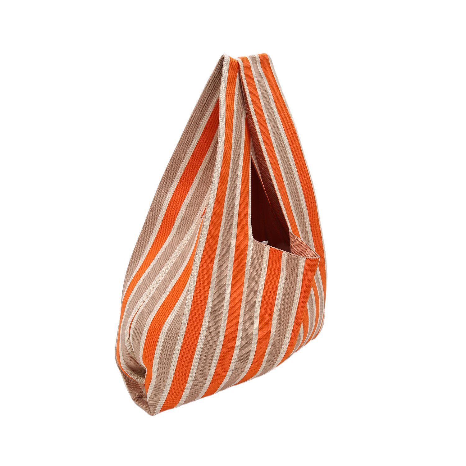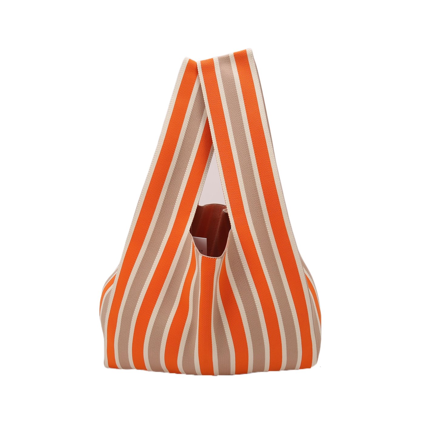 This handbag features a color - blocking design with orange, white, and brown stripes. Its unique design combines practical functions. The bag body can hold daily small items.