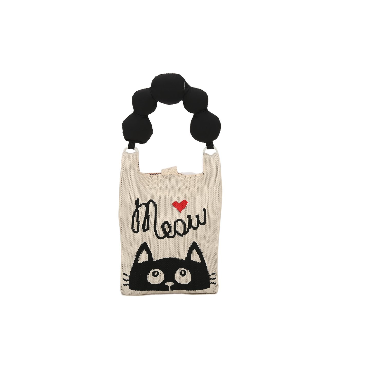 Take ""cat people"" with you! Off - white base + cute cat cartoon prints, and the beaded handle shows ingenuity.