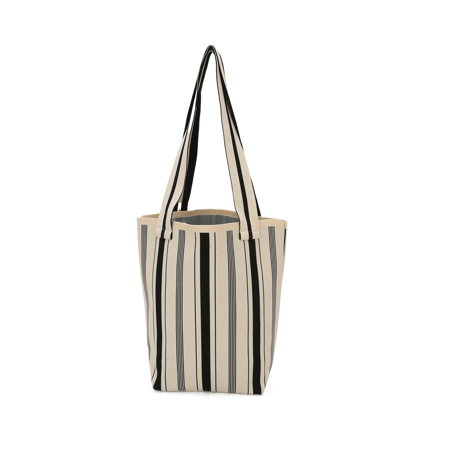 This tote bag is made of polyester fabrics, with an off - white base color paired with classic black stripes. The simple design combines practical functions.
