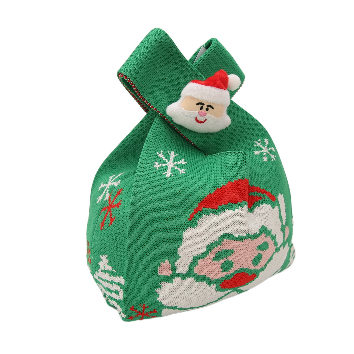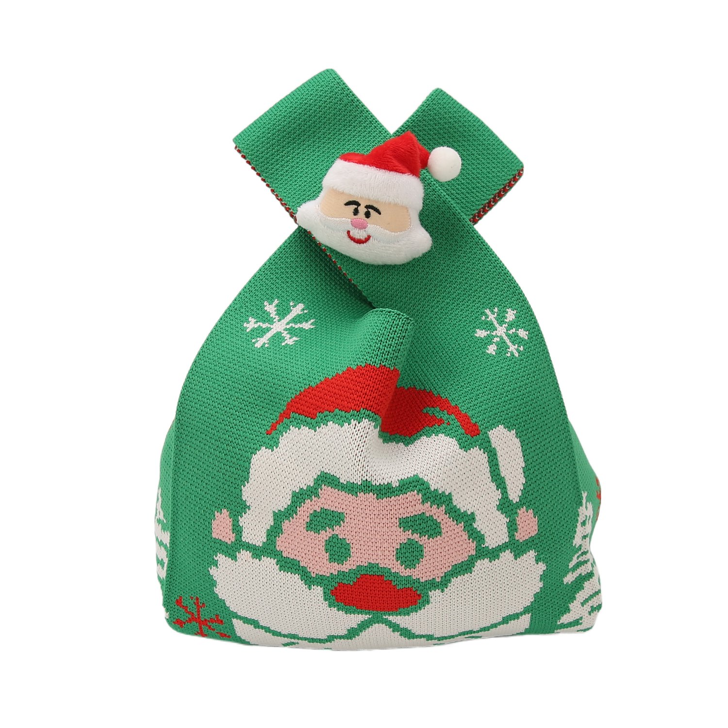 The drawstring bag has a green base and uses a knitting technique to present Christmas elements such as Santa Claus and snowflakes.