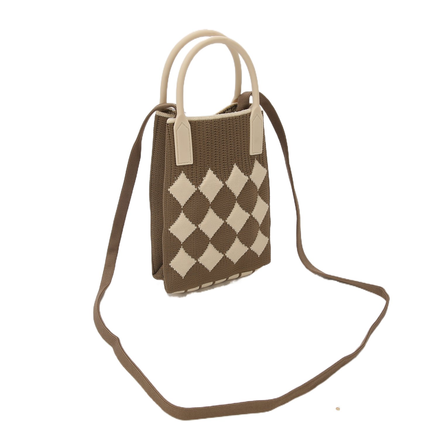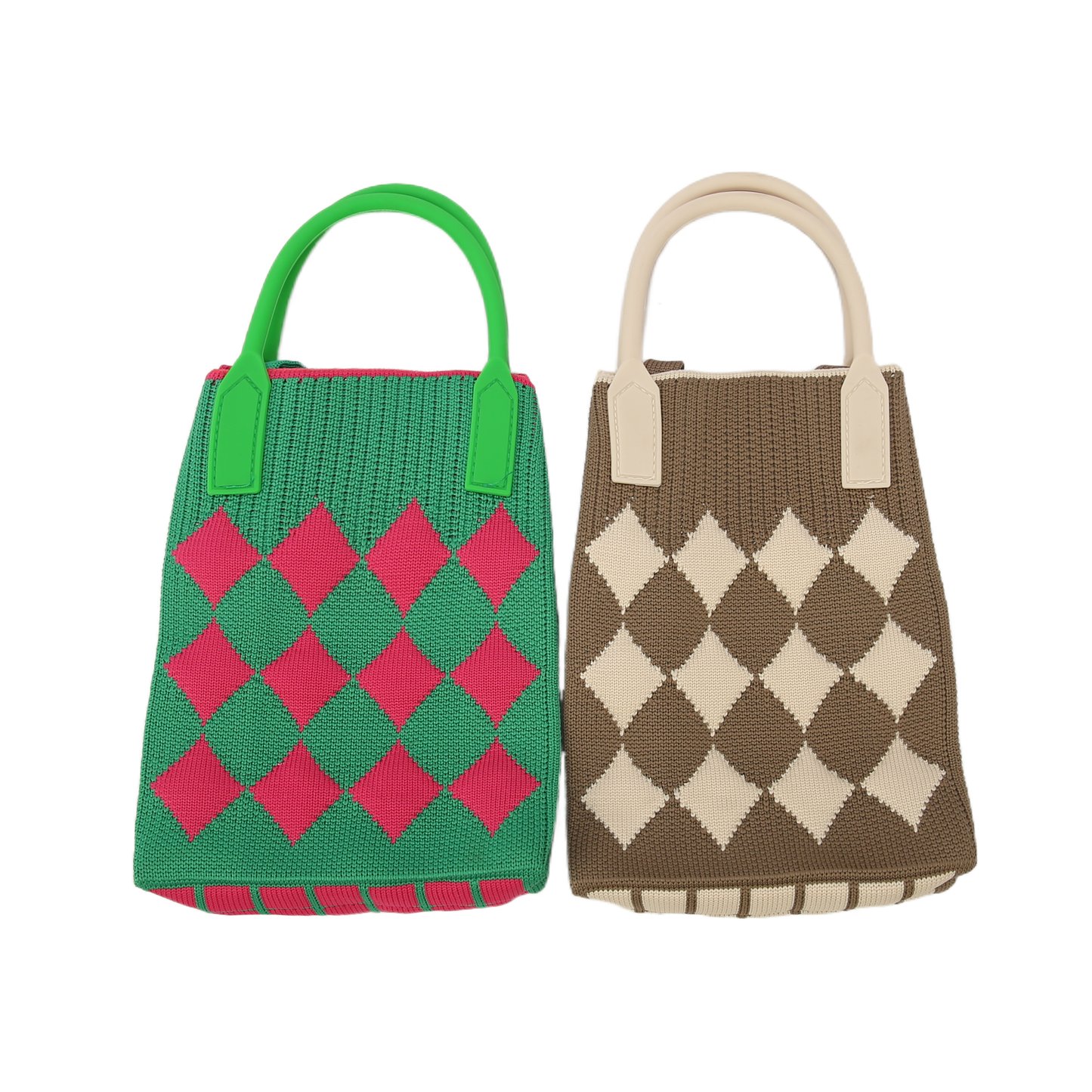 The handbag is crafted with a knitting technique, presenting a diamond - shaped pattern in green - pink and brown - white color combinations respectively.