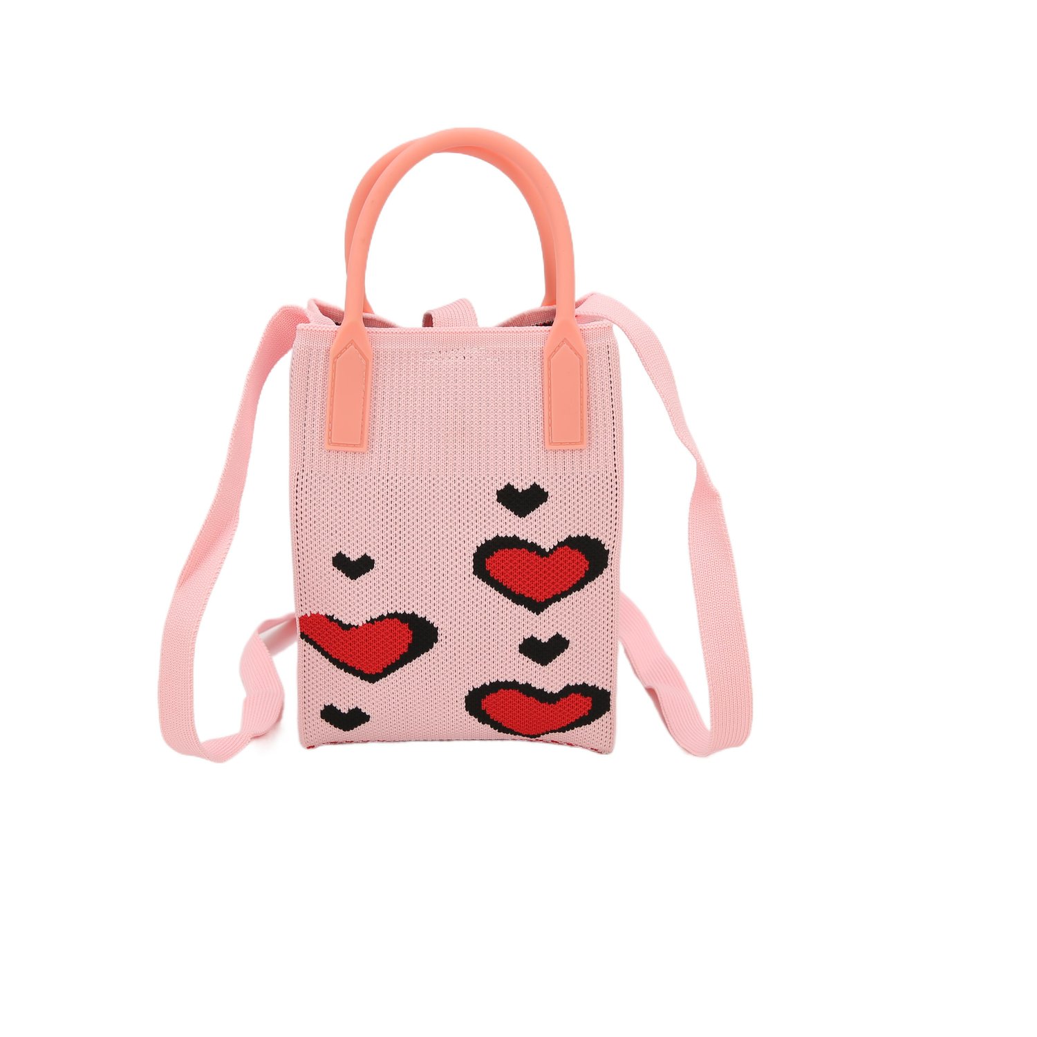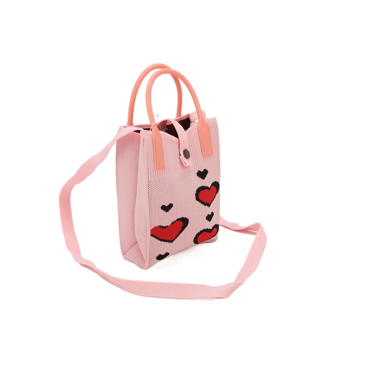 The bag is made of polyester fabrics, with a gentle pink main color and a playful red heart pattern printed on it, integrating a sweet style into a practical design.