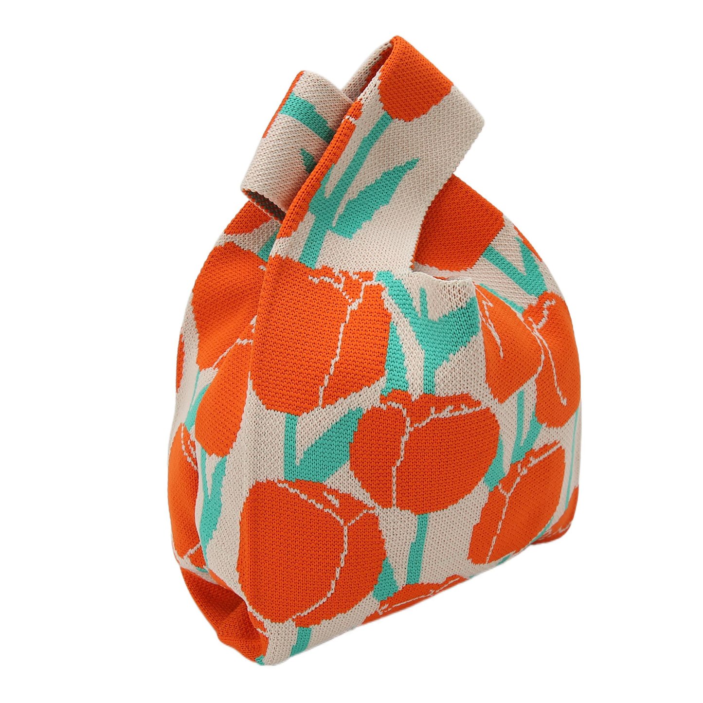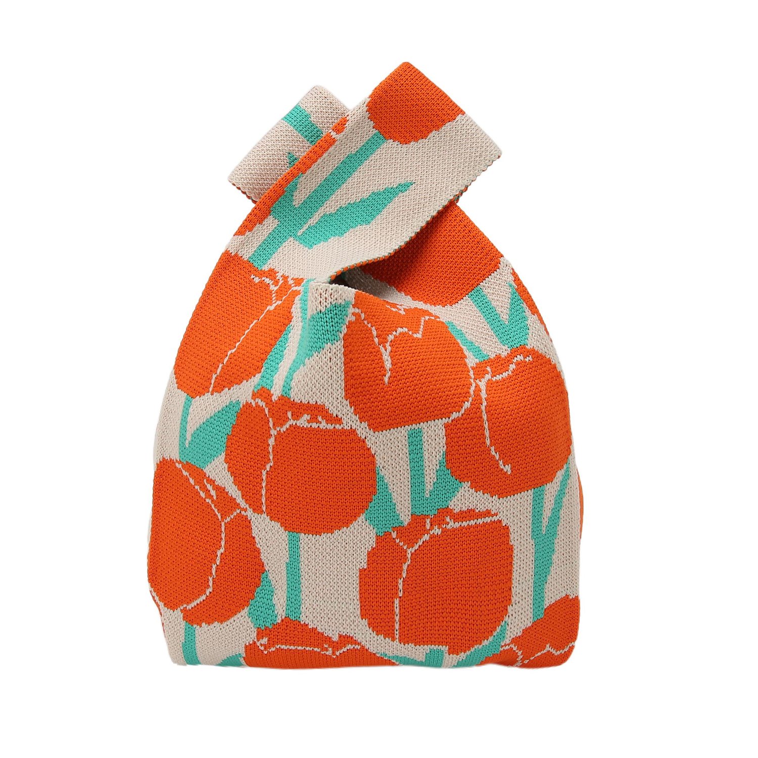 The bag mainly features an orange - white color scheme. It uses a knitting technique to present a tulip print, paired with a unique hand - held design, integrating romantic aesthetics into its compact and practical functions.