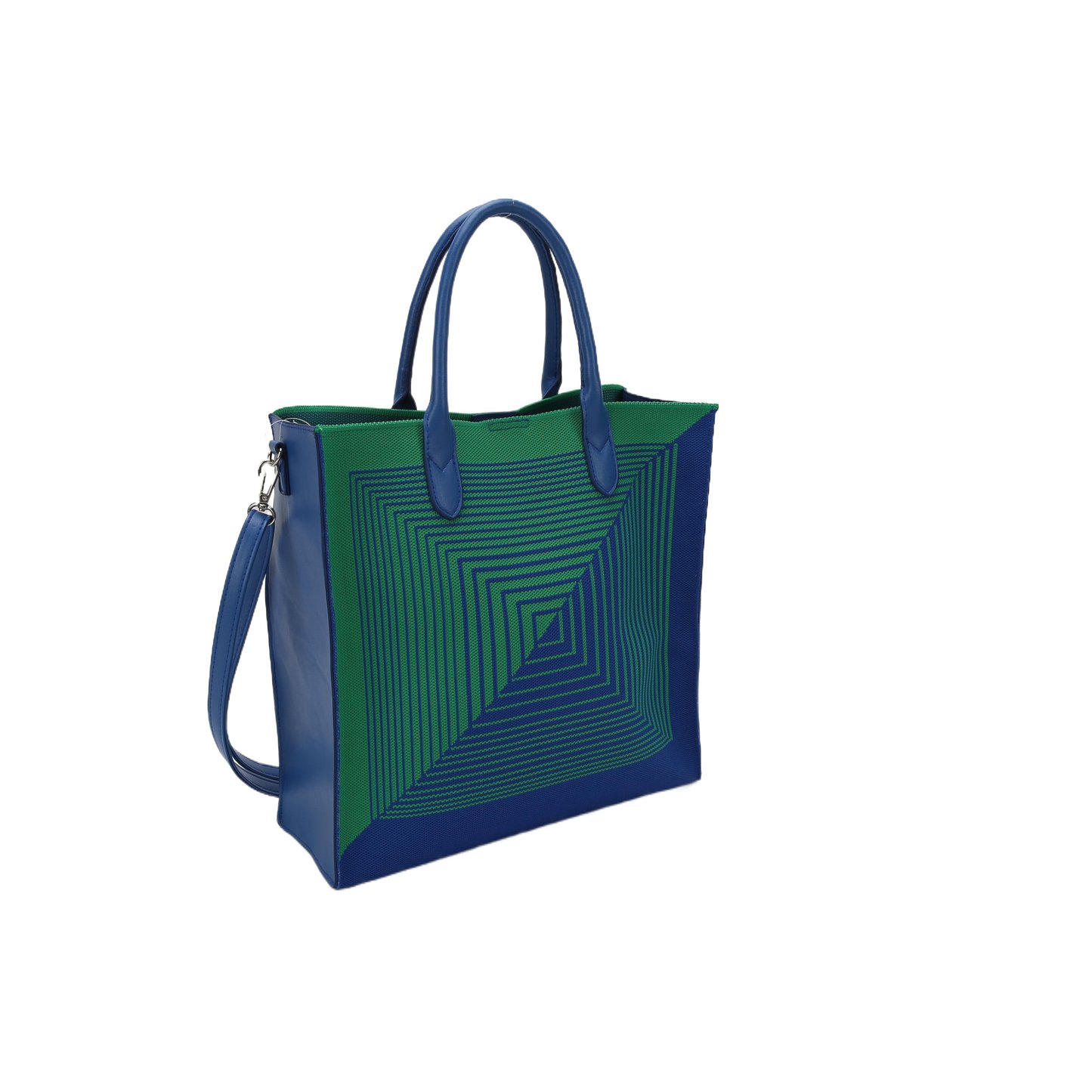 The main body of the bag features a gradient of green and blue, with a design of geometric lines.